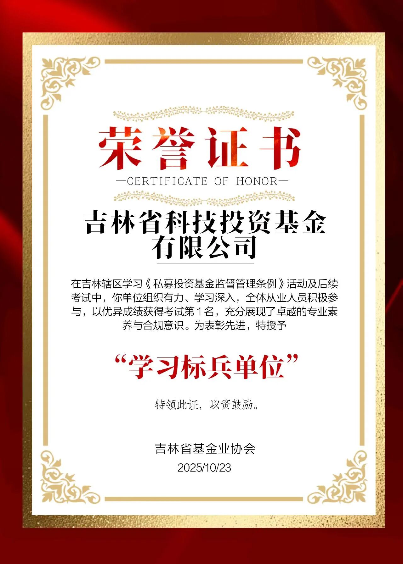我公司榮獲吉林省基金業(yè)協(xié)會《私募投資基金監(jiān)督管理條例》知識競賽第一名,獲評“學(xué)習(xí)標兵單位”